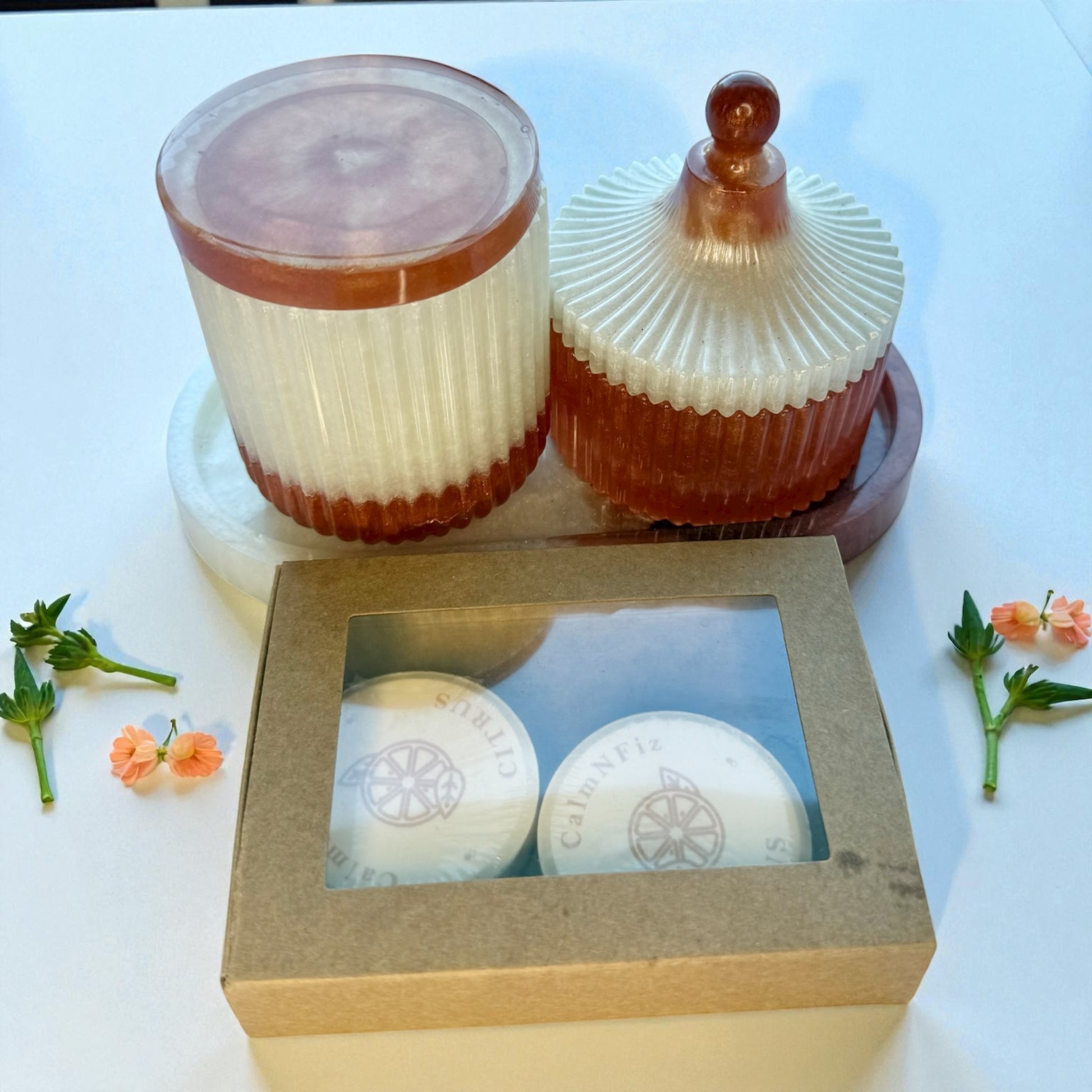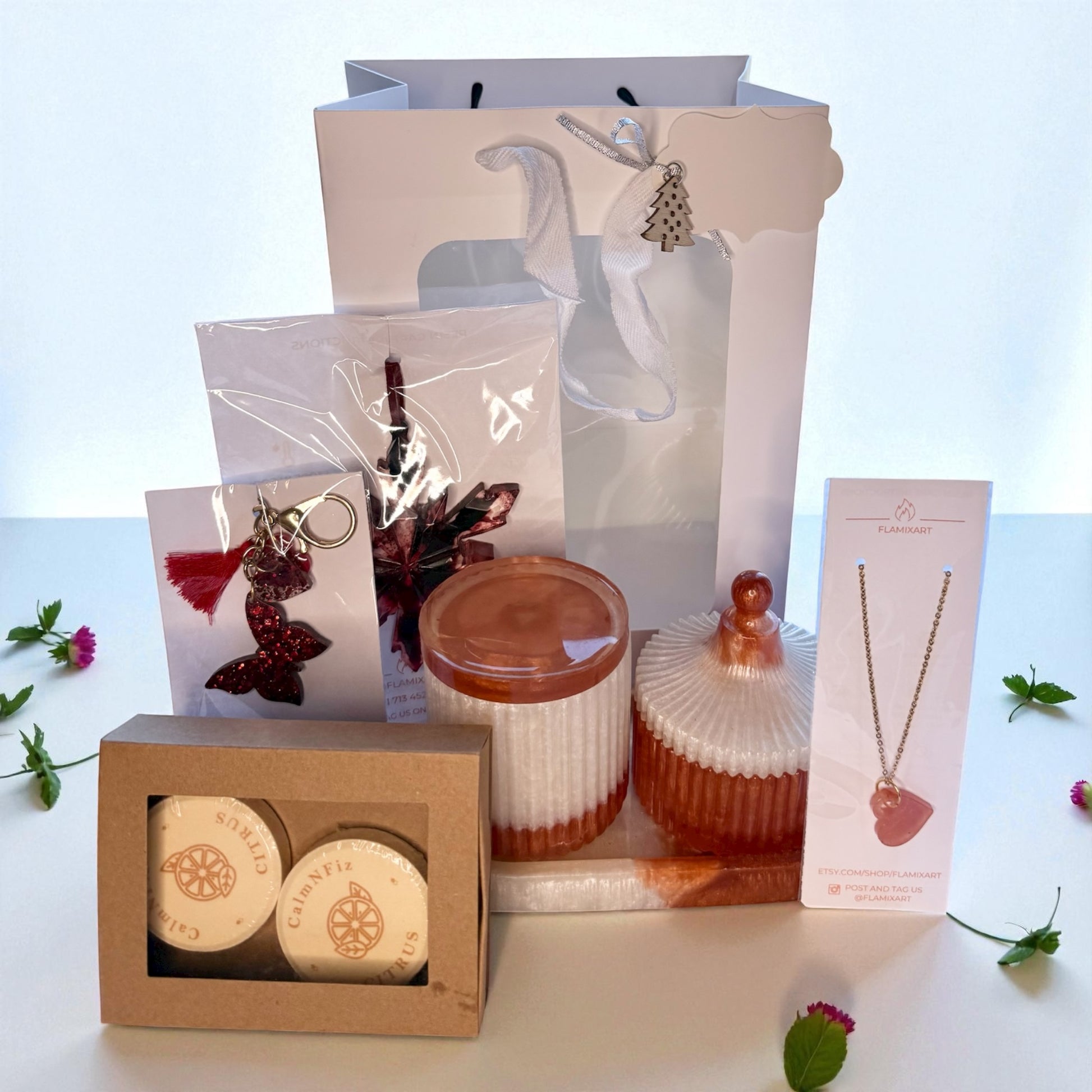 This gift box includes a one-of-a-kind organizer set made of resin. It has a tray and 2 jars to help you put things in place. :)