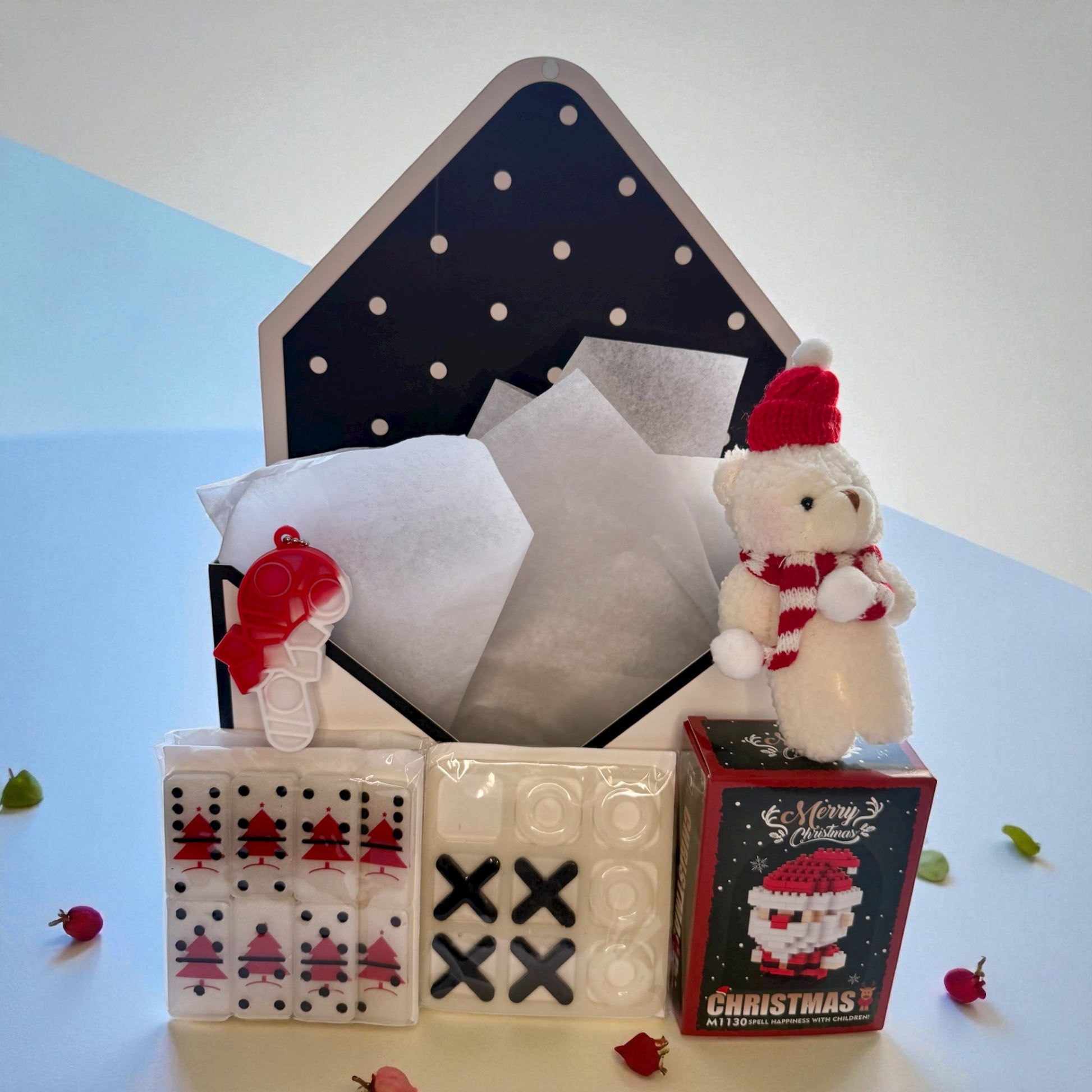 You've got mail! :) This gift box includes a one-of-a-kind Christmas-themed domino set made of resin. It is a unique, handmade item that has been exclusively added to this curated box.