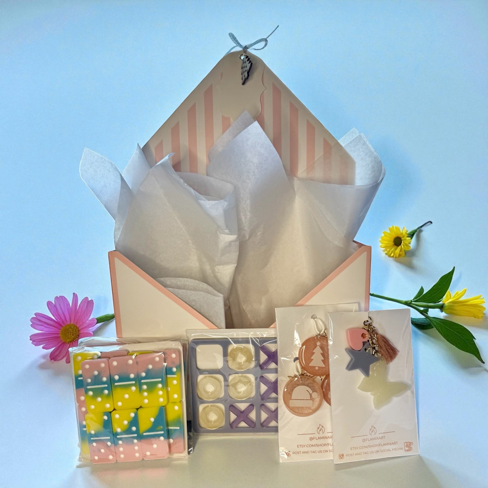 You've got mail! :) This gift box includes a one-of-a-kind tie-dye domino set made of resin. It is a unique, handmade item that has been exclusively added to this curated box.