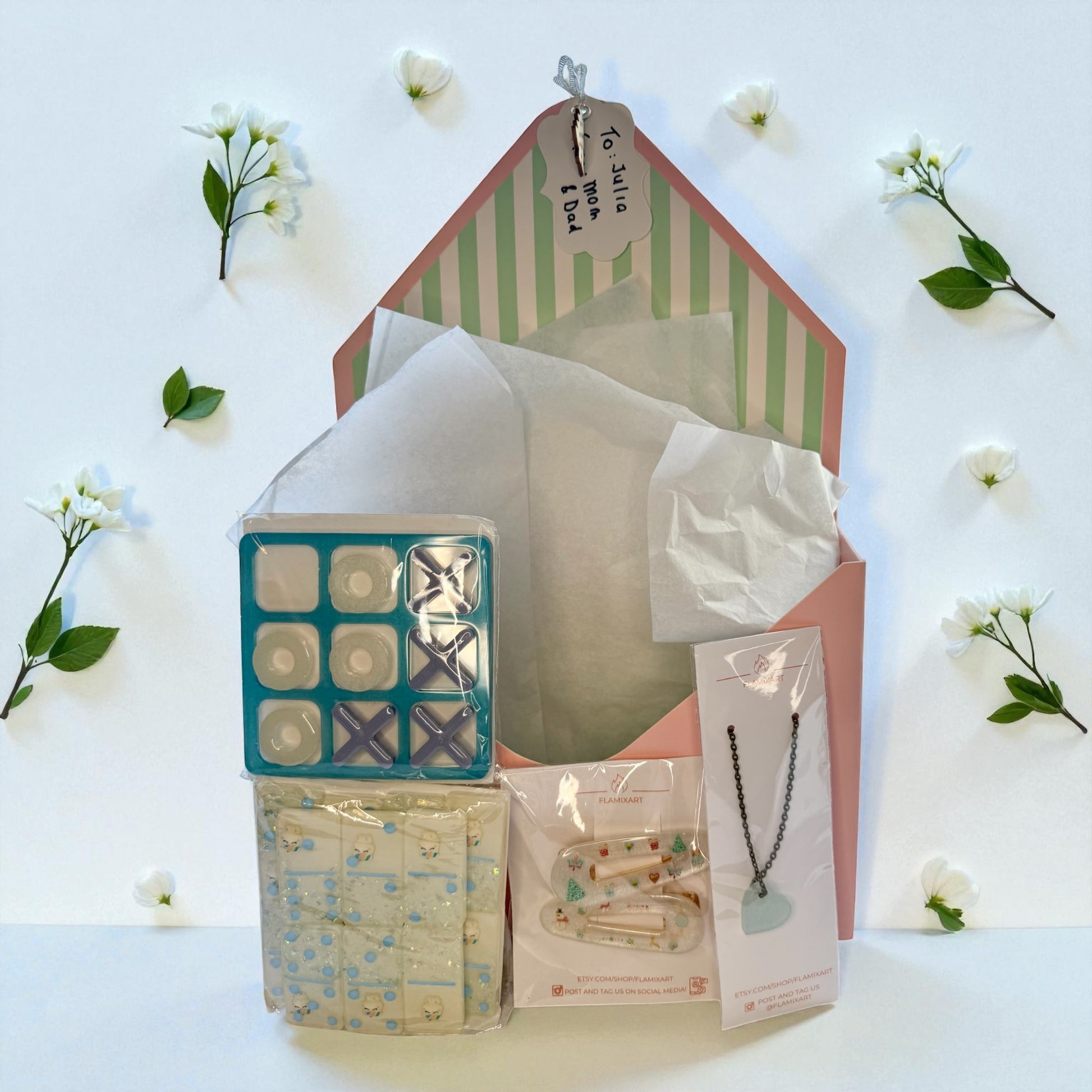 You've got mail! :) This gift box includes a one-of-a-kind unicorn domino set made of resin. It is a unique, handmade item that has been exclusively added to this curated box.