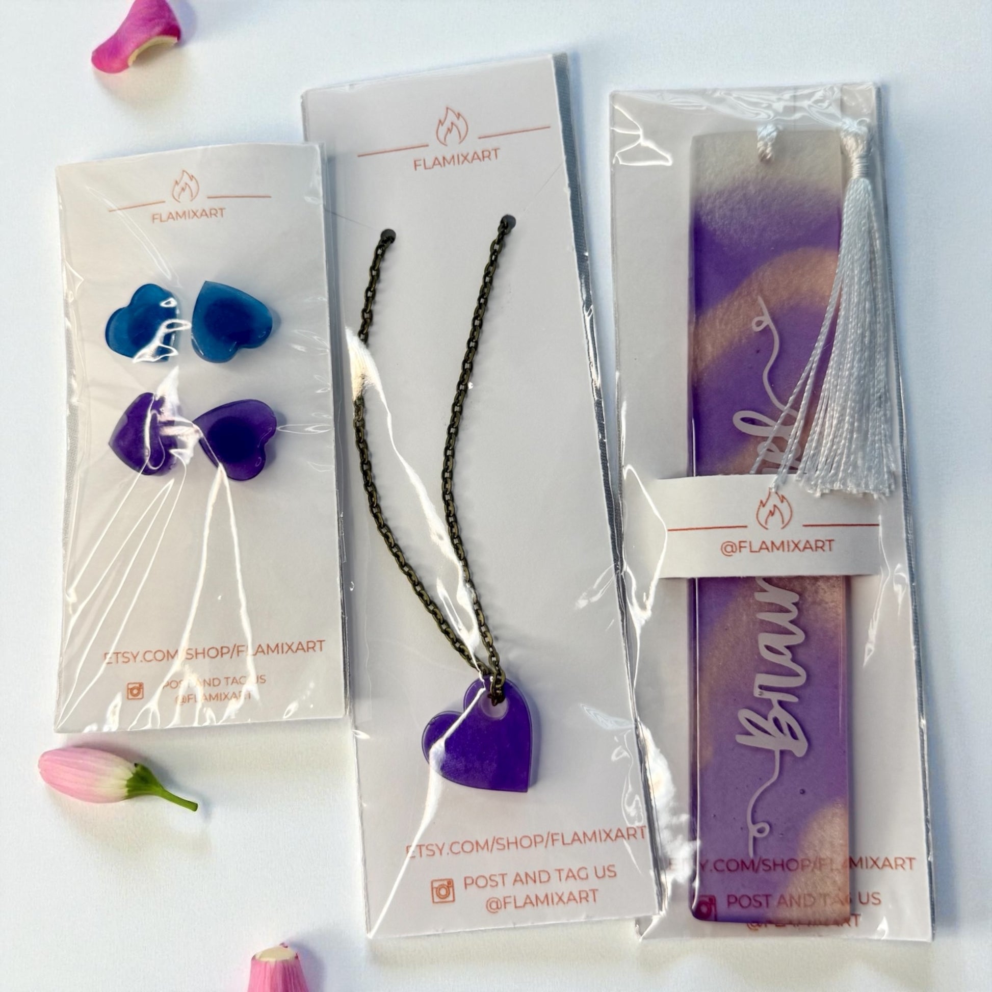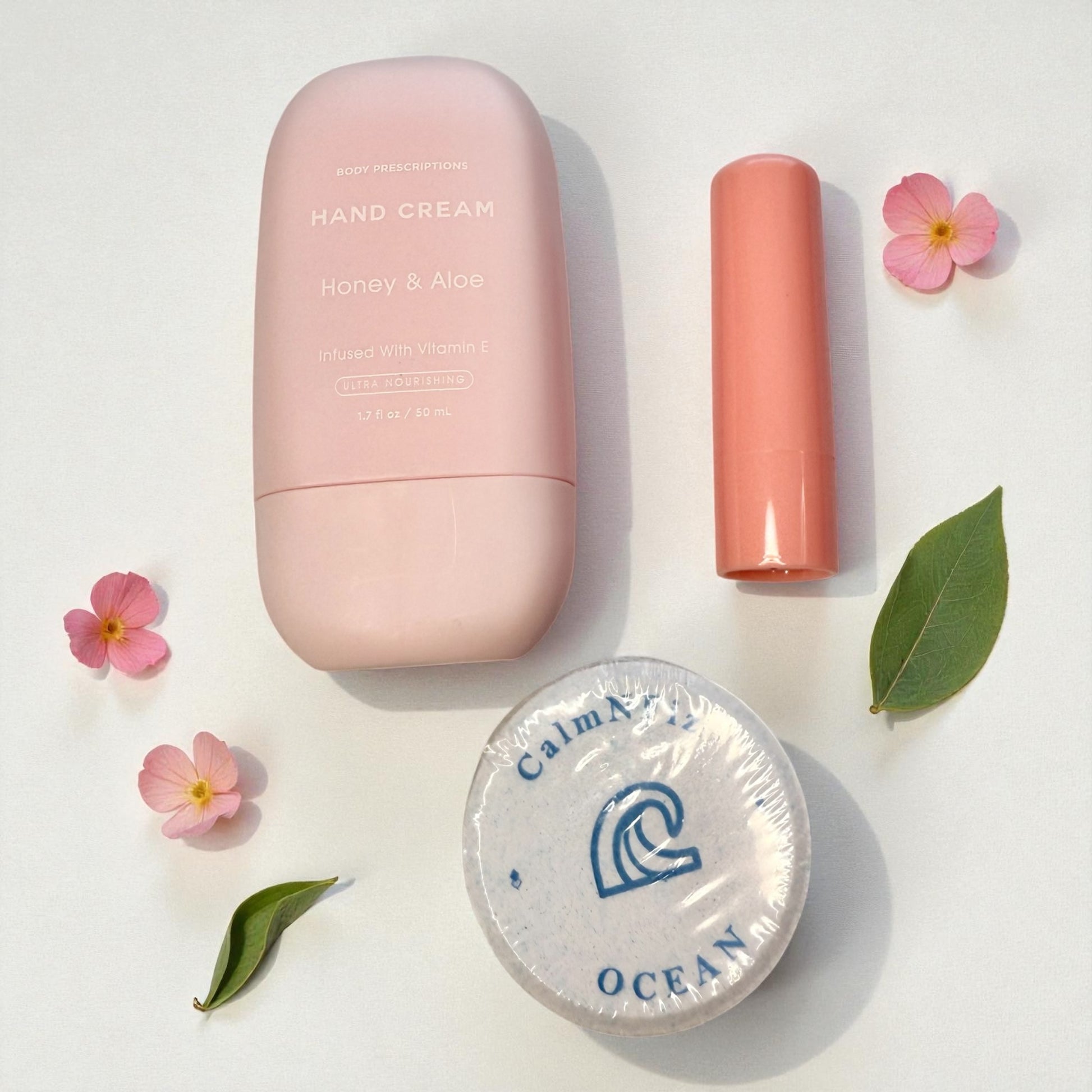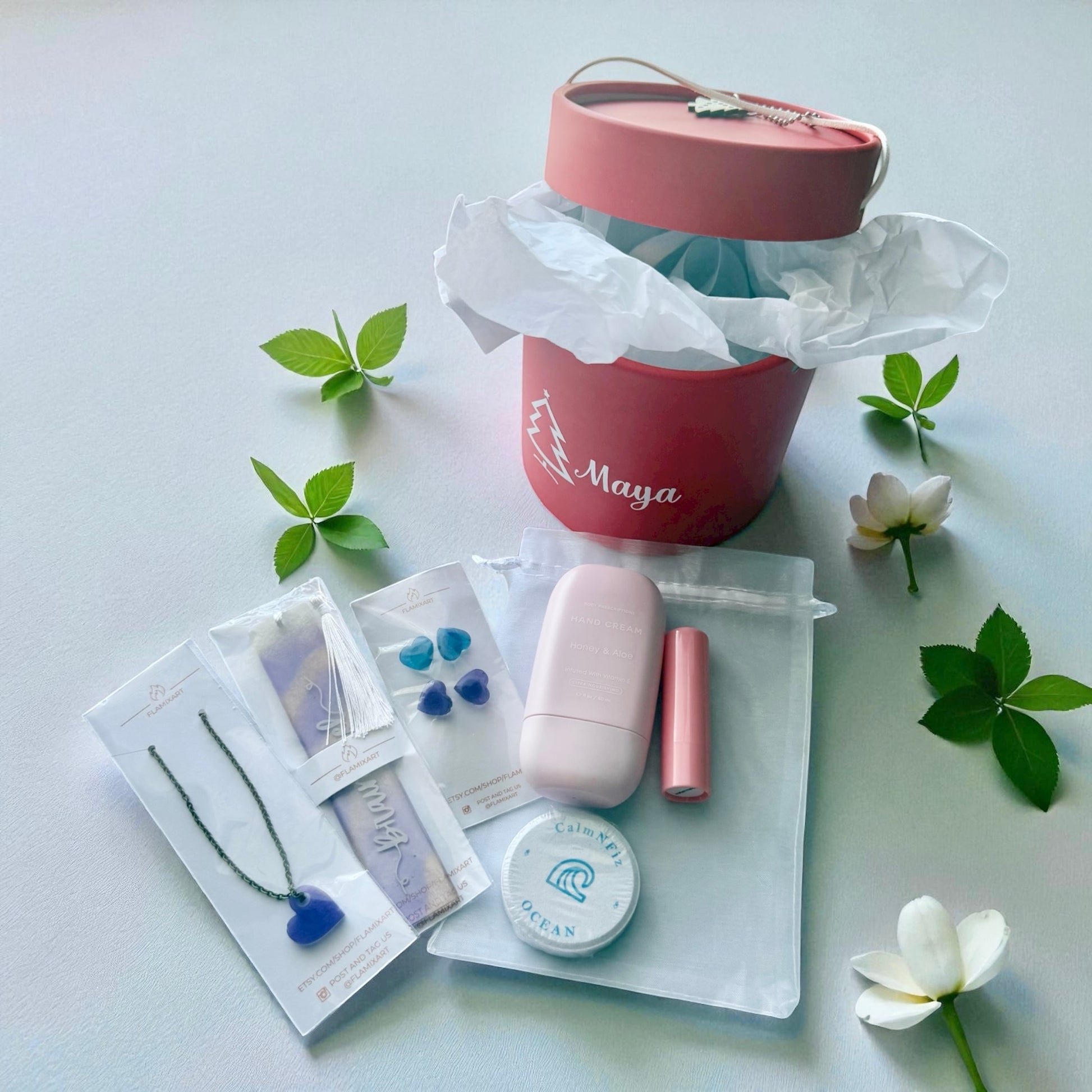 Mark your place in a favorite book, and add a touch of sparkle to your day with your earrings and necklace. Then treat yourself with your shower steamer tablet, hand cream, and lip balm.